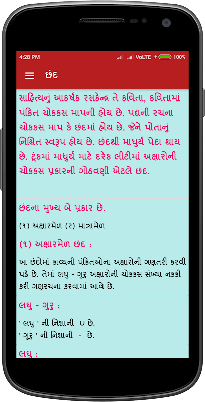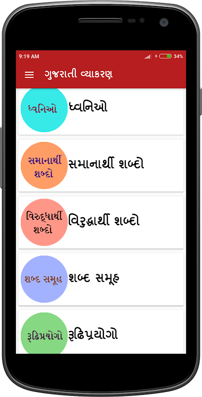 Gujarati Grammar In Gujarati app include Alankar, jodani, Krudant, Nipat, Vibhakti, Chhand,