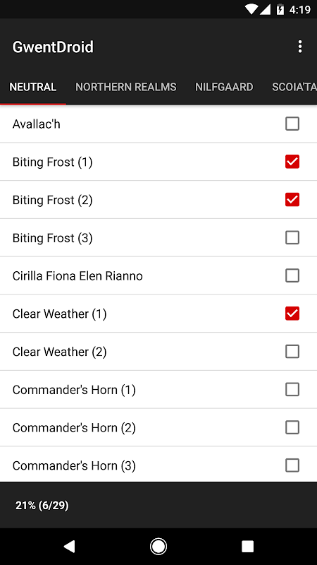 Using this list you can check off the cards you have collected in the game, leaving you with a clear overview of which cards you need to find and how many are left. GwentDroid also gives you a handy percentage reference to the total cards of each set that you have, i.e 50%.