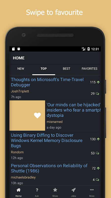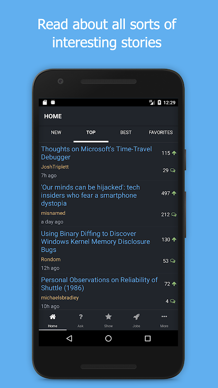 Read your favorite Hacker News (https://news.ycombinator.com/) stories in this dark themed app.