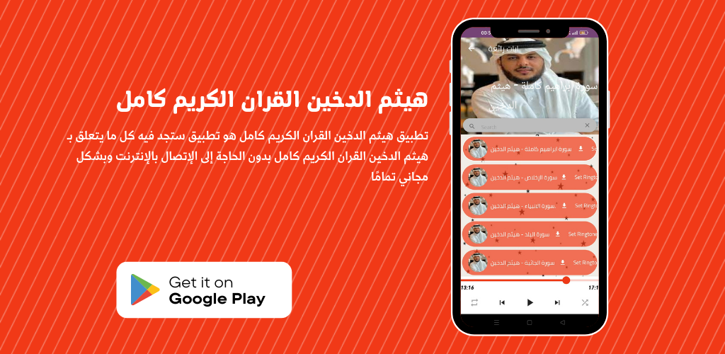The application of reciting the Qur’an with the voice of Haitham Al-Dukhin is free and available on the store for Android phones. You can download the application of the Noble Qur’an with the voice of Haitham Al-Dukhin with ease so that you can enjoy reciting the Noble Qur’an with the voice of Sheikh Haitham Al-Dukhin. The application of the Noble Qur’an with the voice of Haitham Al-Dukhin allows you to hear the surahs of the Noble Qur’an with ease through one program that contains all the surahs of the Noble Qur’an,