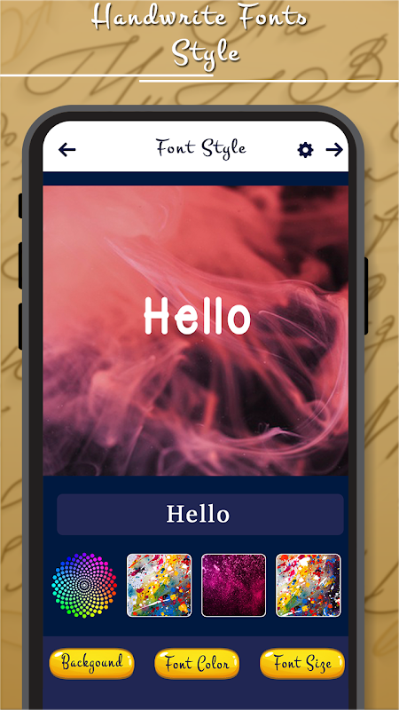 Handwrite Fonts Style app with not only Handwrite font style bt app also allows the option to personalize your choice Background with amazing font styles. It is easy and simple to use by any users, Just select your choice BG from the collection and apply text styles with your own words and save it. App also allows users to amazing font styles to change it and also change the size of the text. App with share your wish text into amazing font styles.