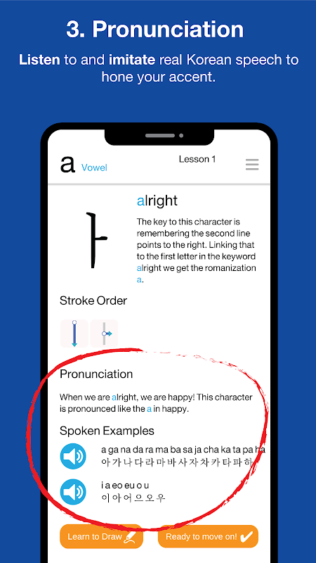 Aprenda as primeiras 6 letras Hangul de graça! Se você estiver impressionado, desbloqueie o restante do curso com uma pequena compra no aplicativo.