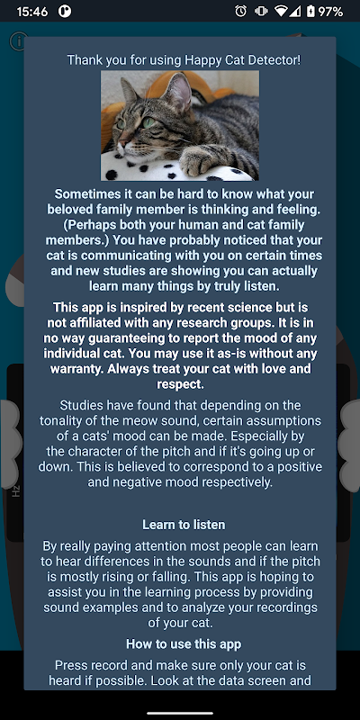 Este aplicativo é inspirado na ciência recente, mas não é afiliado a nenhum grupo de pesquisa. Não é de forma alguma garantido relatar o estado de espírito exato de qualquer gato individualmente.