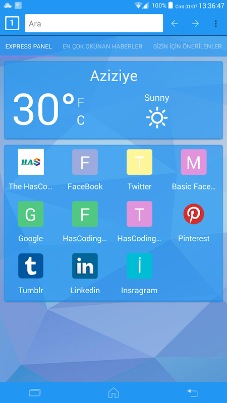 Browser ana sayfasında hava durumu gösteren bi ekran hemen altında yer işaretlerinize hızlı ulaşabileceğiniz bir arayüz
