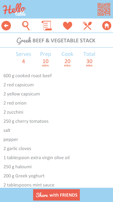 Em um esforço para tornar a sua vida mais simples, Olá Tabela ajuda a planejar e cozinhar suas refeições, criando uma lista de compras a partir de receitas do livro de receitas tabela verão. Cada receita tem um código - uma verificação rápida gera uma lista de compras para essa receita em seu telefone. Você pode, então, atravessar fora os itens que você já tem e ir às compras.