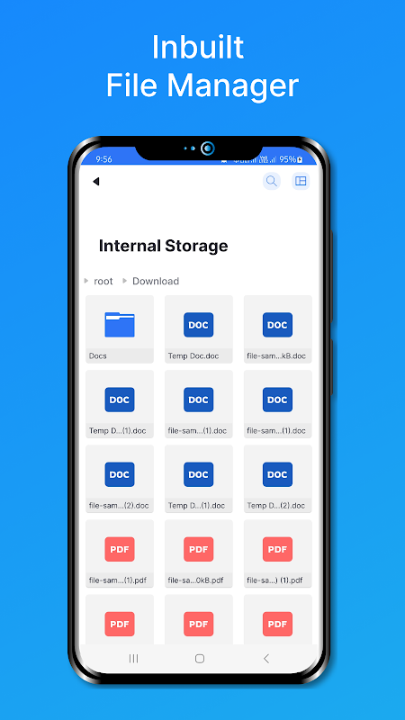 2.1 Armazenamento Interno: É um Gerenciador de Arquivos embutido onde você pode encontrar todas as funcionalidades necessárias do Gerenciador de Arquivos. Inclui PDF Viewer onde você pode visualizar ou visualizar arquivos PDF. Inclui Image Viewer onde você pode visualizar ou visualizar arquivos de imagem. Possui diferentes tipos de visualizações e técnicas de classificação onde você pode alterá-lo para o selecionado e salvá-lo. Para seleção de arquivos e pastas, o gerenciador de arquivos embutido fornece três tipos de técnica de seleção, como Troca, Intervalo e Selecionar Tudo. Você pode compartilhar, excluir, visualizar detalhes de um ou vários arquivos e renomear arquivos selecionados.