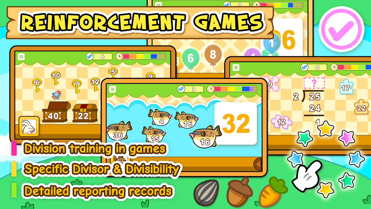 O Treinador de Divisão foi projetado especificamente para crianças dominarem o cálculo de divisão por meio de jogos e personalizarem seu próprio conjunto de questionários e exercícios.