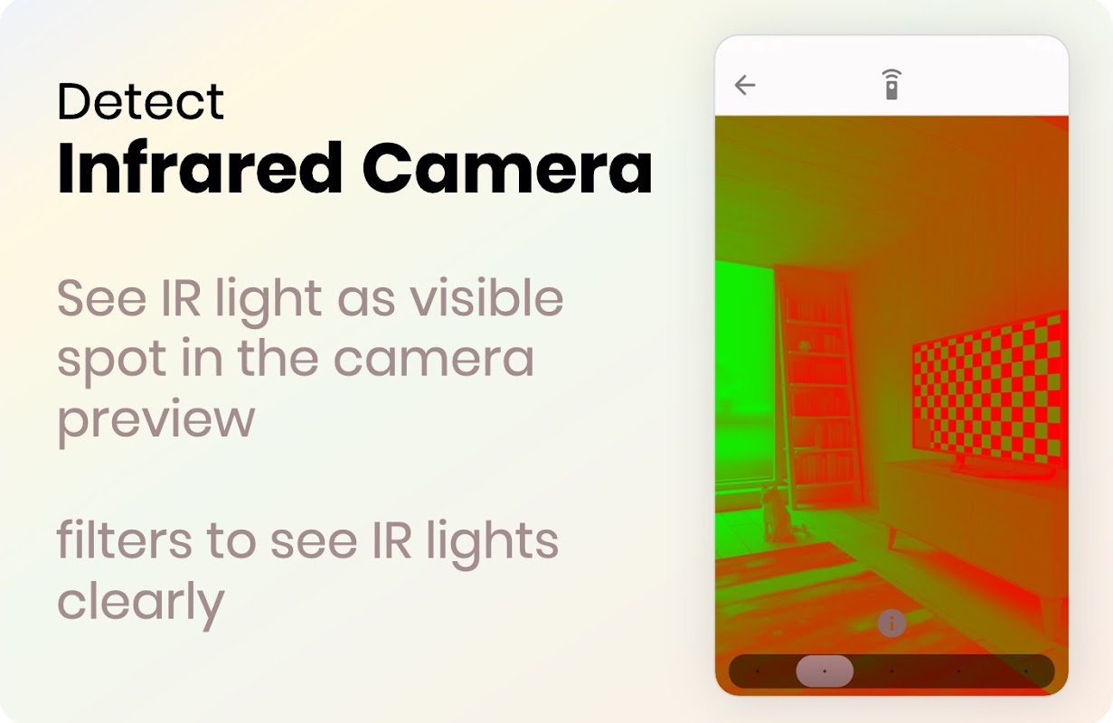 Detetor de câmera infravermelha - Este aplicativo tem mais uma ferramenta que é detectar luzes infravermelhas. Basta abrir o detector infravermelho e procurar luz branca que aparece na tela, mas não é visível a olho nu. Essa luz branca indica luz infravermelha. Pode ser uma câmera infravermelha. Sua câmera normal também pode detectá-lo, mas o que temos é um recurso embutido com efeito de luminescência.