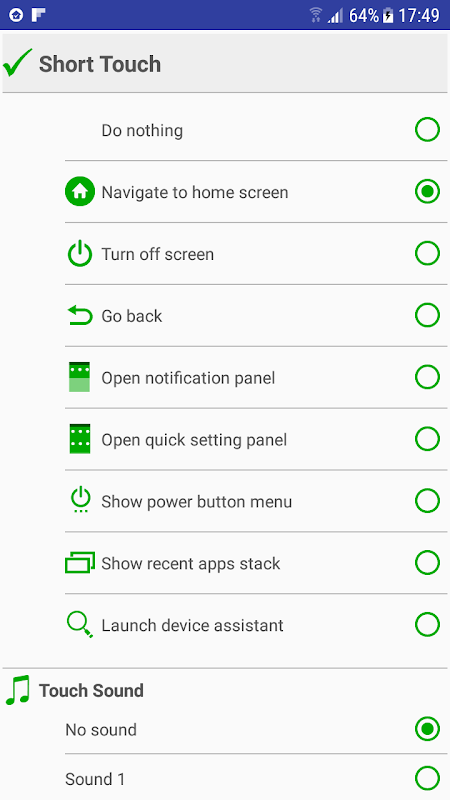 ★ Available actions: navigation to home screen, turn off screen, toggle control desk, take screenshot, navigation back, open notification panel, open quick setting panel, show power button menu, show recent app stacks, launch device assistant, launch camera, switch to previously used app, and show application switcher (similar to Alt+Tab on Windows, switching back and forth between recent applications has never been so easy with this one-touch concept implemented in HomeTouch)
