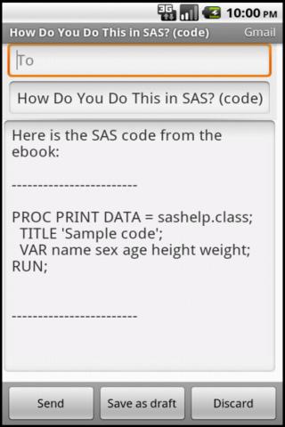 Este aplicativo: "Como você faz isso Em SAS?", É uma introdução livre para uma série de eBooks sobre a programação de software SAS enfocando as perguntas mais frequentes e respostas, ilustrado por exemplos de código que podem ser enviados por e-mail diretamente do aplicativo. A série de ebooks foi concebido para incentivar os usuários a contribuir com algumas das questões que serão incluídas em futuras versões do aplicativo. Há controles para selecionar questões específicas, se deslocam para a pergunta anterior ou seguinte, diminuir ou aumentar a fonte para atender a preferência do usuário, e enviar e-mails solicitando respostas para perguntas ainda não incluídos nessa versão do e-book.