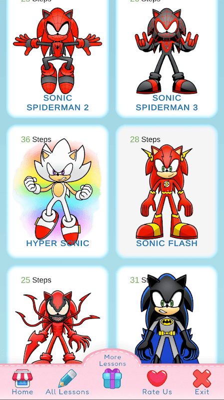 O que fazer no aplicativo? Primeiro, selecione o personagem que deseja desenhar. Depois de escolher um herói, comece a lição! Repita todos os passos dados na lição e você desenhará facilmente vários personagens do Sonic. Acredite, você não precisa de nenhuma experiência ou habilidade de desenho. Tudo dará certo! Siga as lições do aplicativo Como desenhar o personagem Sonic passo a passo e o resultado não demorará muito para chegar!