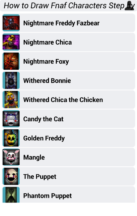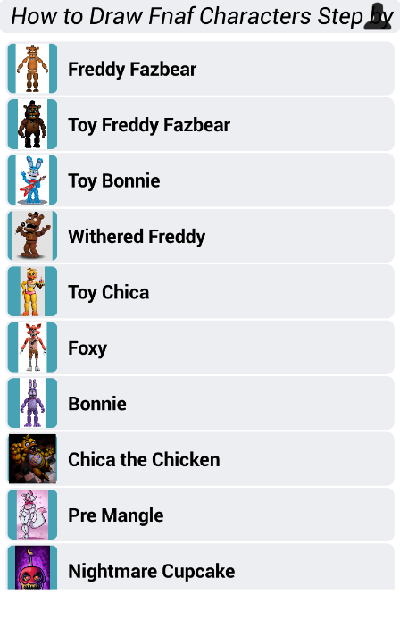 This Apps is a step by step instruction which will teach you How to Draw Fnaf Characters step by step. Like a personal art teacher, it will teach you how to draw dozens of different objects step by step and create amazing design, you can choose a character that you like and start to draw it.