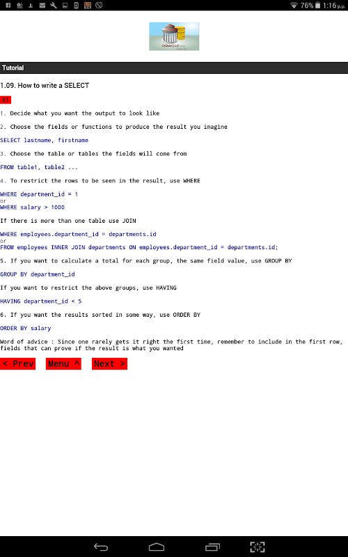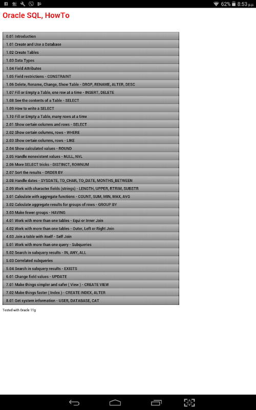 This application is a Tutorial and How To Guide for the popular Oracle Data Base Management System, Structured Query Language (SQL).