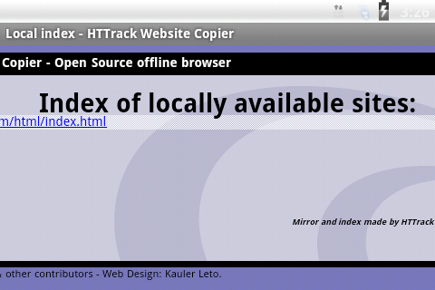 HTTrack é um utilitário de navegação em offline, permitindo-lhe descarregar um World Wide website da Internet para um directório local, construíndo recursivamente todos os directórios, obtendo o html, imagens, e outros ficheiros do servidor para o seu computador.