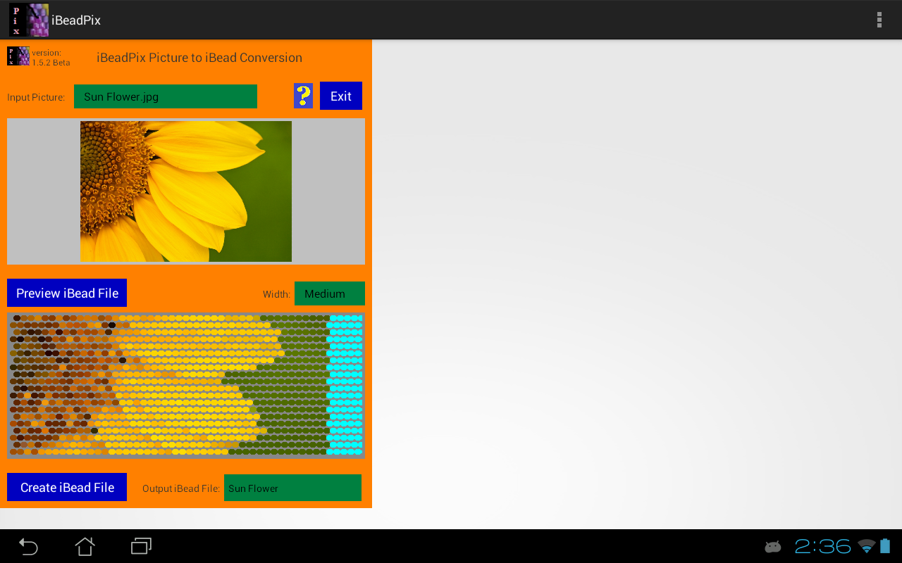 iBeadPix is a companion app to the iBead Peyote Ex app. iBeadPix converts pictures to beading patterns that can be used by iBead Peyote Ex. Picture files must be either Png or Jpeg files, that is, the picture file must have a .png or .jpg extension (such as "mypicture.png" or "anotherpic.jpg").
