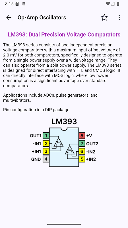 O aplicativo oferece uma coleção abrangente de mais de 120 tutoriais e diagramas de circuitos, abrangendo circuitos com temporizadores 555 e aplicações práticas, osciladores lógicos CMOS da série 4000, osciladores TTL das séries 74LS e 74HC, geradores de forma de onda baseados em amplificadores operacionais e multivibradores de transistores. Projetado para iniciantes em eletrônica, estudantes, entusiastas e engenheiros profissionais, o aplicativo serve como uma ferramenta completa de referência e aprendizado para projetar, entender e construir osciladores, multivibradores, geradores de pulsos e circuitos de forma de onda comumente usados em eletrônica analógica e digital.