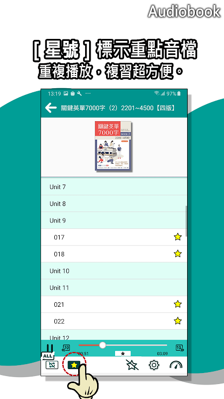 ● [Star Bookmark] pode ser definido para marcar os principais arquivos de áudio de revisão, que podem ser reproduzidos repetidamente.