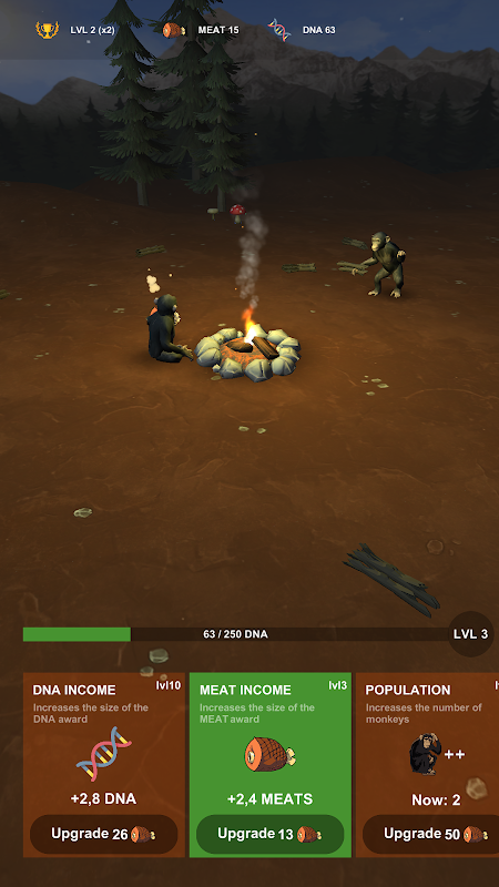 Este jogo casual é muito divertido. Os macacos jogam gravetos e galhos no fogo porque precisam que a carne seja cozida 🍖. Quanto mais carne eles tiverem, mais recompensas de DNA receberão. O DNA é essencial para evoluir de macaco para humano.