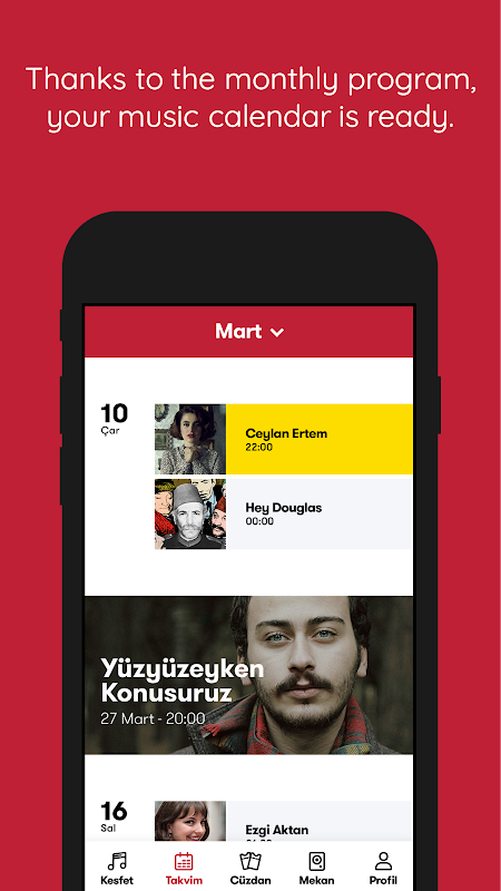 Etkinliklerde sahne alacak müzisyenler hakkında bilgilere ulaşır ve müziklerini dinlersiniz.