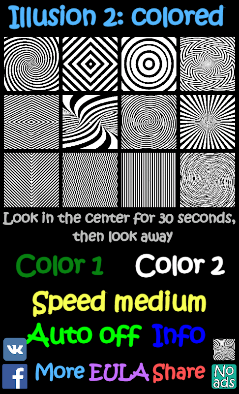 Instructions: Select one of the effects in the main menu and look in the center for 30 seconds. Try not to look away. After 30 seconds turn the view on any object. Use the "Auto off/on" to turn on/off automatic shut-off effect.
