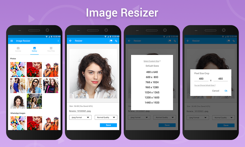 Baixe o nosso novo Resizer Android App Imagem; Ele rapidamente redimensiona imagens de formatos aceitos no único mencionando a nova altura ou largura necessária, com opções espontâneas