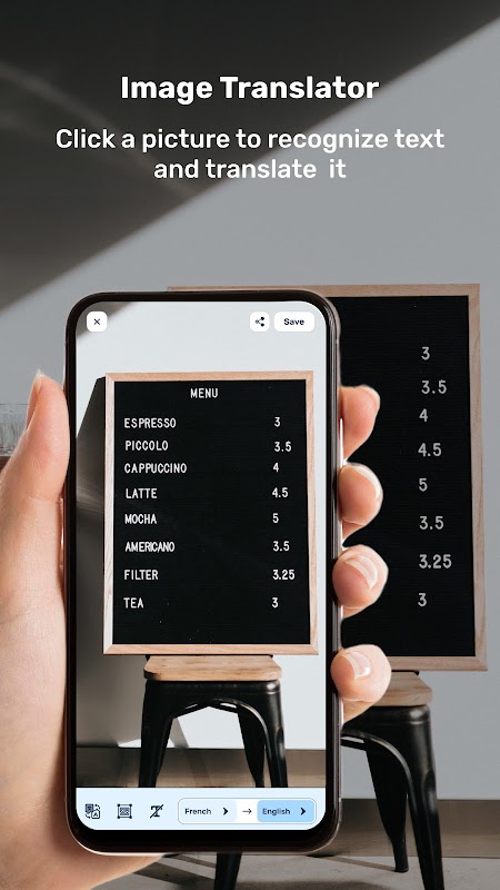 - Basta escolher os idiomas de origem e destino, tirar uma foto ou selecionar uma imagem da sua galeria e deixar que nosso aplicativo faça o resto.