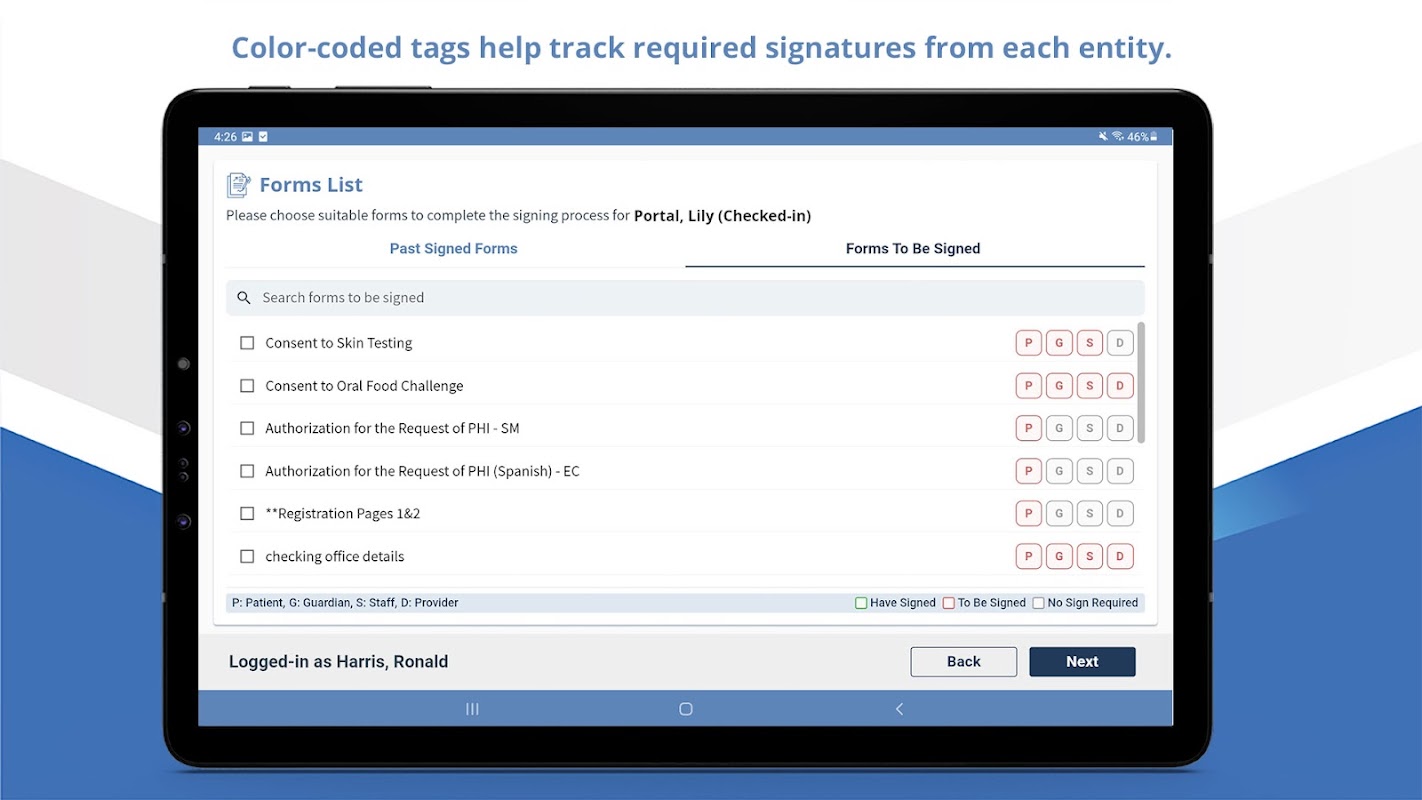 Obtenha acesso rápido aos pacientes registrados e escolha em uma lista de todos os formulários de consentimento pré-configurados para capturar assinaturas.