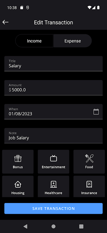 ⇨ Tipos de transação: a criação de orçamentos é uma parte essencial para acompanhar suas despesas. Você pode criar despesas mensais em todas as categorias selecionando o tipo de receita ou despesa.