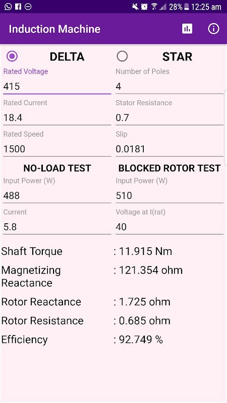 Esta aplicação pode calcular os parâmetros da máquina de indução, nomeadamente resistência do rotor, reactância do rotor, o torque no eixo e a eficiência de detalhes nome placa.