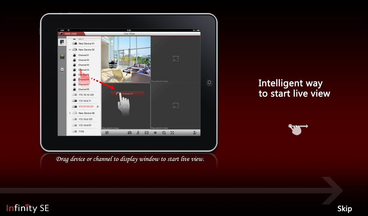 Infinity SE HD (Android Tablet) mobile client software, which is designed for Android Tablet on the basis of Android OS (Version 3.0 or higher), can be used to remotely monitor the live video from embedded DVR, NVR, network camera, network speed dome and encoder via wireless network, play back record files, control alarm output and realize PTZ control as well.