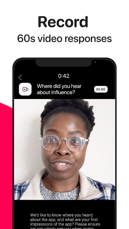 A influência permite que você faça pesquisas em vídeo por dinheiro e seja ouvido por suas marcas favoritas por meio de seu feedback gravado sobre elas.