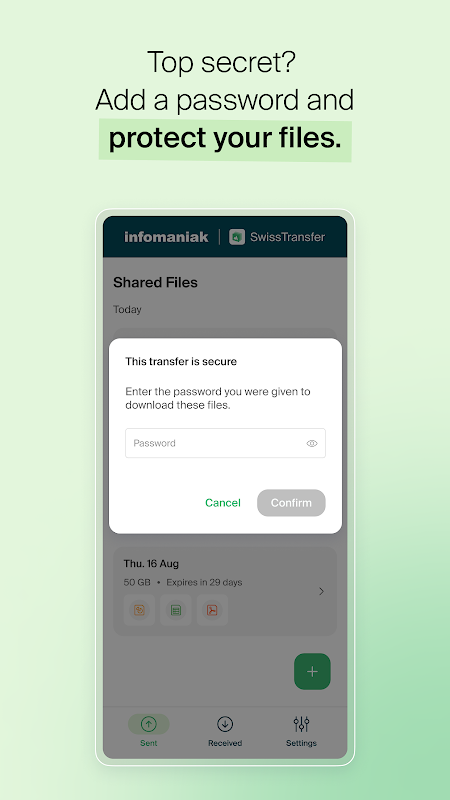 Baixe o aplicativo oficial SwissTransfer.com para Android, desenvolvido pela Infomaniak.