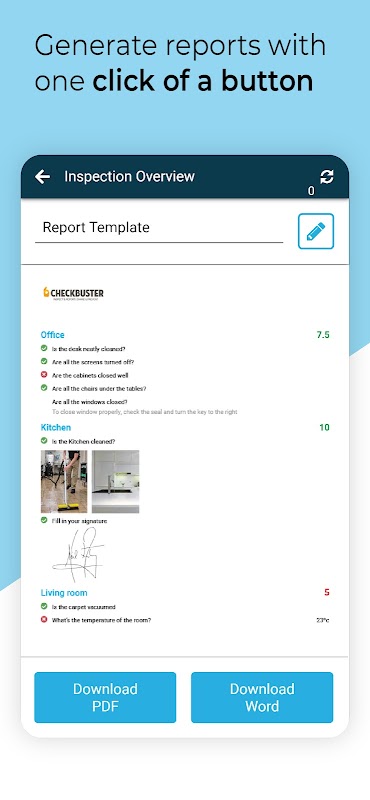 Checkbuster é o aplicativo líder em inspeção de segurança e auditoria (ISO) para Android. Com base em nossa experiência de usuário mundial em inspeções de segurança e qualidade e relatórios de incidentes, criamos um aplicativo para conduzir, relatar e compartilhar resultados de inspeção e auditoria dentro das equipes.