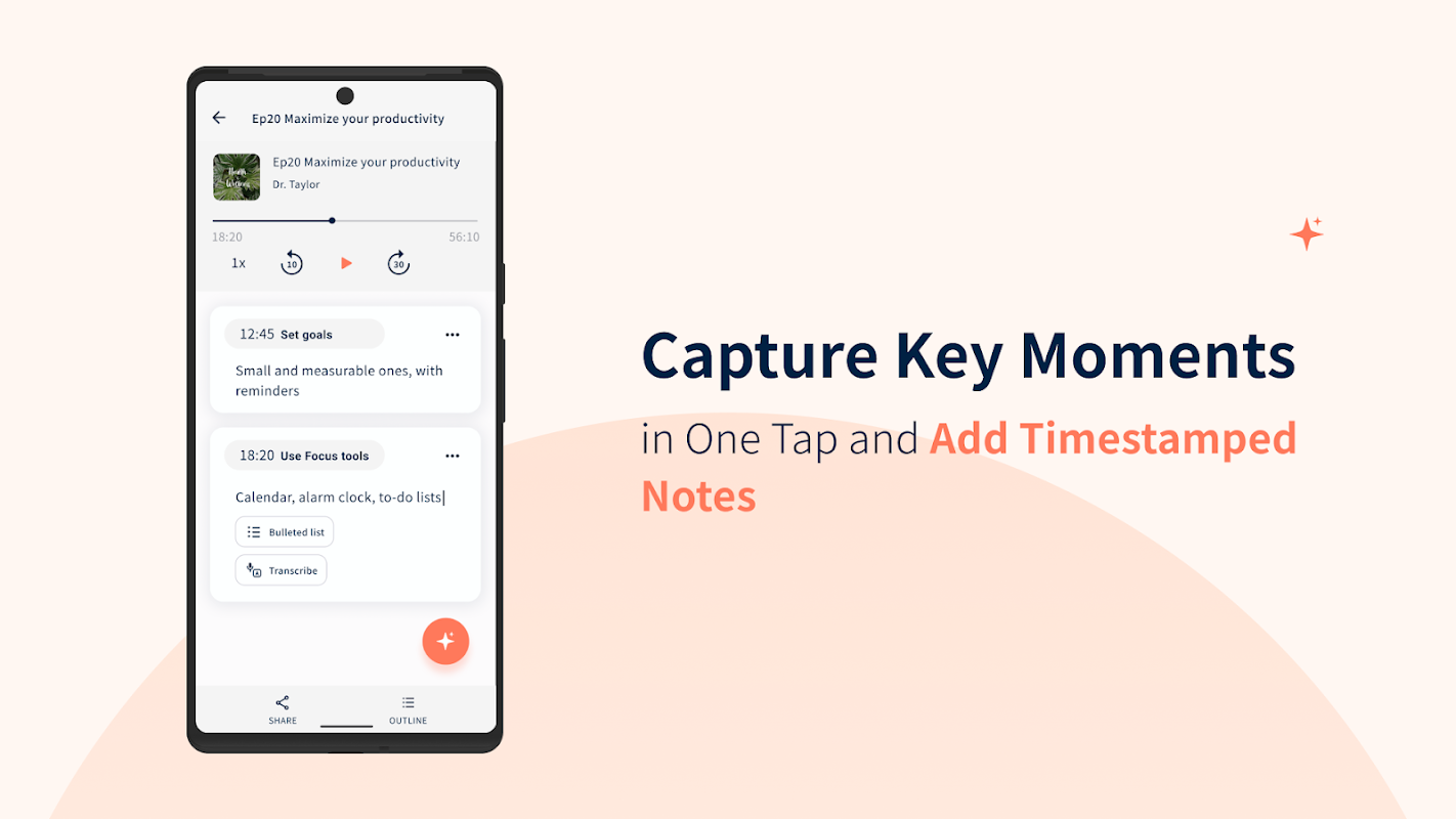 - Crie vários cartões de momento com timestamps e notas para um episódio