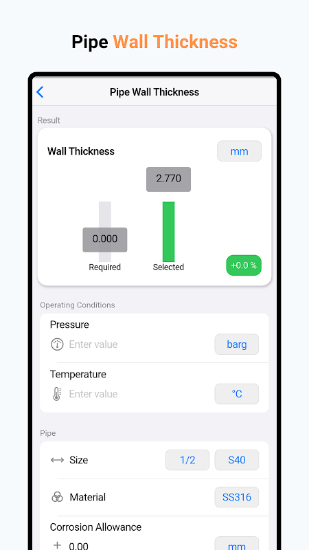 Este aplicativo é o companheiro ideal para engenheiros de instrumentação, processos, mecânicos e de tubulação, bem como para estudantes e profissionais técnicos que precisam de ferramentas de engenharia rápidas, confiáveis e precisas em trânsito.