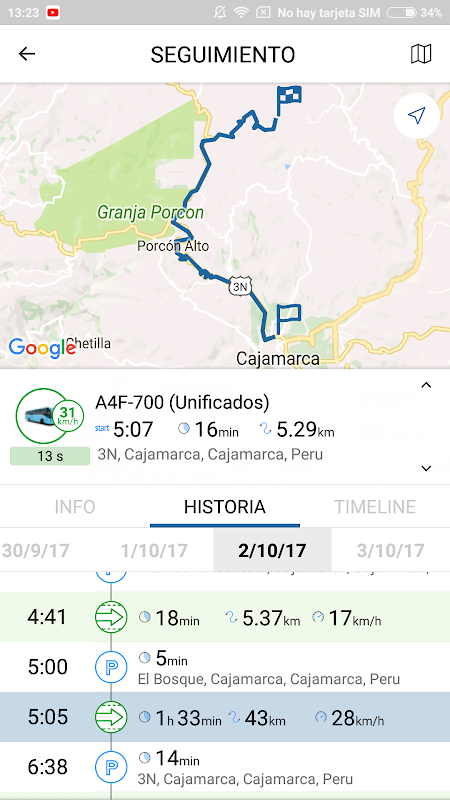 recorrida, pudiendo elegir un rango de fechas para mostrar la ruta o