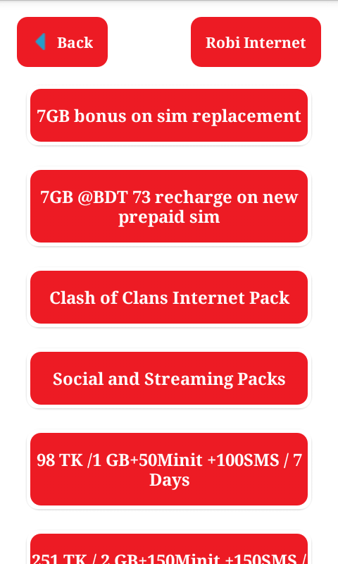 ” Internet package Robi-রবি ইন্টারনেট প্যাক” আমাদের এ এ্যাপস টিতে রবি সিমের সকল নতুন আপডেট বিভিন্ন ইন্টারনেট প্যাকেজ এর তথ্য দিয়ে সাজানো হয়েছে। আপনাদের আর কষ্ট করে দোকানদার দের বলতে হবে না শুধু মাত্র আমাদের এ এ্যাপস আপনার মোবাইল এ থাকলে আপনি নিজে নিজেই বিভিন্ন ইন্টারনেট প্যাকেজ নিতে পারবেন অতি সহজেই । যেভাবে ইন্টারনেট নিবেন , প্র্রথমে কোন প্যাকেজ টি নিবেন তা দেখুন, এবং সে প্যাকেজ টির activation code Dial এর উপর চেপে ধরে কোডটি সিলেট করে তা Copy করে ,আপনার মোবাইলের Keypad এ তা Paste করুন । তাহলে নির্দিষ্ট পরিমান ইন্টারনেট প্যাকেজ টি পেয়ে যাবেন ।