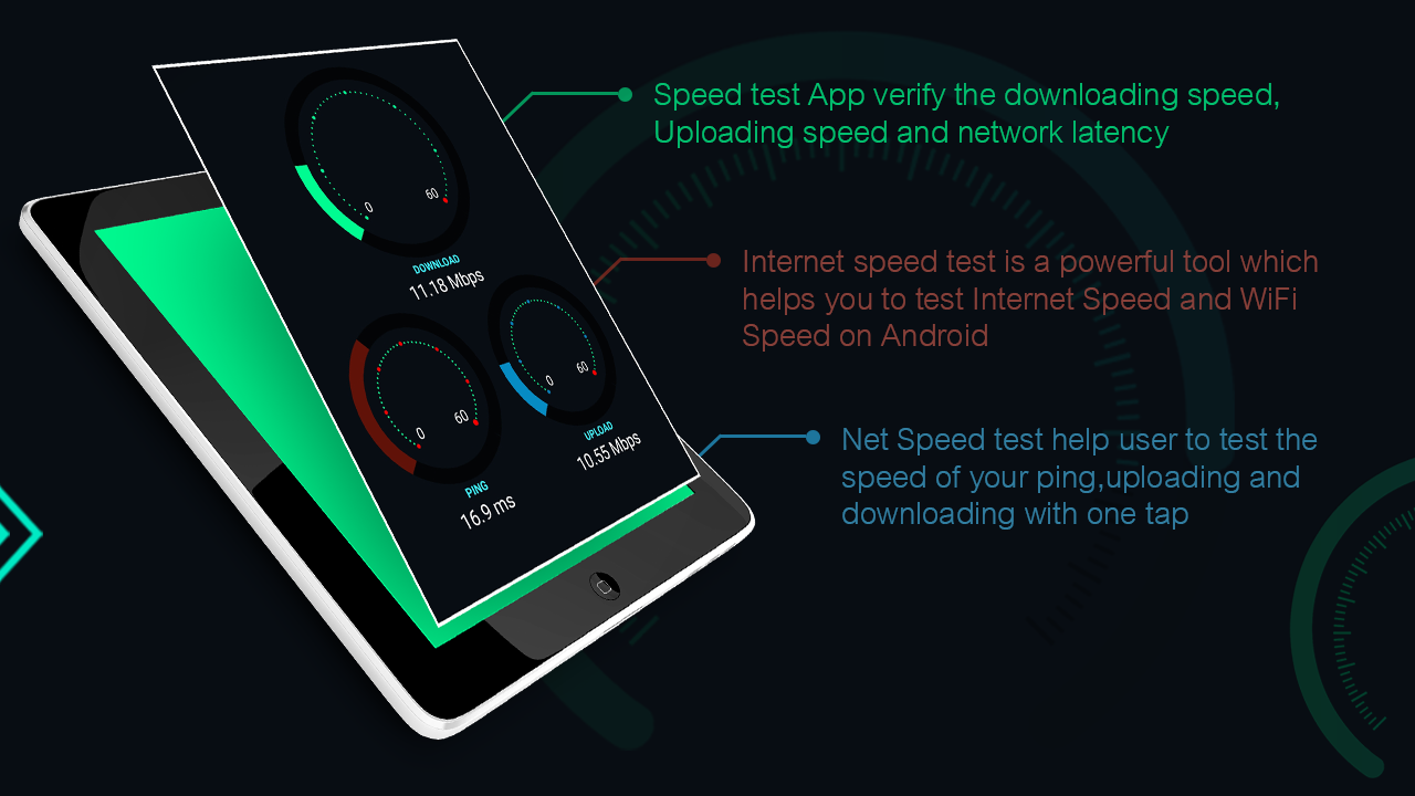 Internet speed meter, net speed meter App verify the downloading speed,Uploading speed and network latency.