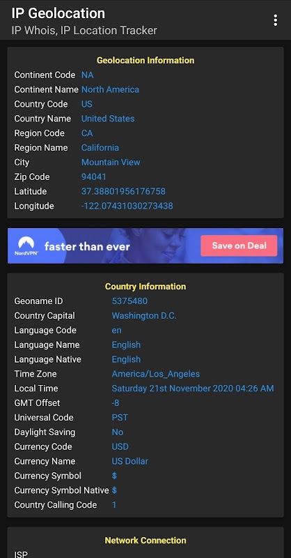 Este detector de Geo IP Location é útil para quem procura um serviço preciso de pesquisa de IP e pesquisa de domínio. Ele responderá a perguntas como Qual é meu IP, Quais são minhas coordenadas, Qual é a hora exata, Qual é meu ISP< /b>, Meu local de IP.