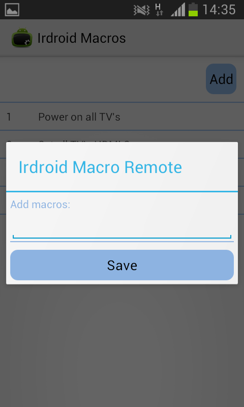 The application allows you to setup custom Infrared remote control sequences/macros, from the app main screen tap on Add in order to add new Macro. Enter the name of your new macro and tap on SAVE. In order to add command sequences to your new macro long click on the newly created macro and select "Edit Macro" a new screen will pop up and you can use the Add button to add custom commands to your newly created macro. To execute a macro just tap on the macro name. After you create your new macro you may create a custom shortcut to the macro by long tapping on the macro name from the list of macros. Tap on Shortcut and a new shortcut to your macro will be added to the home screen. Executing a macro from a shortcut is a matter of just tapping on the shortcut.