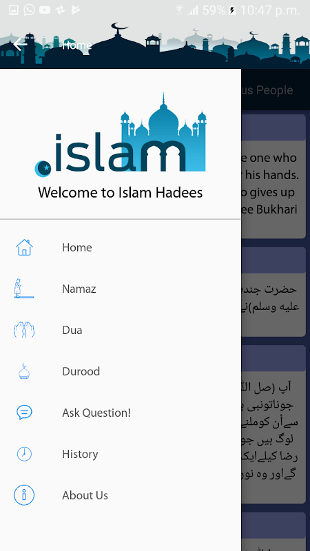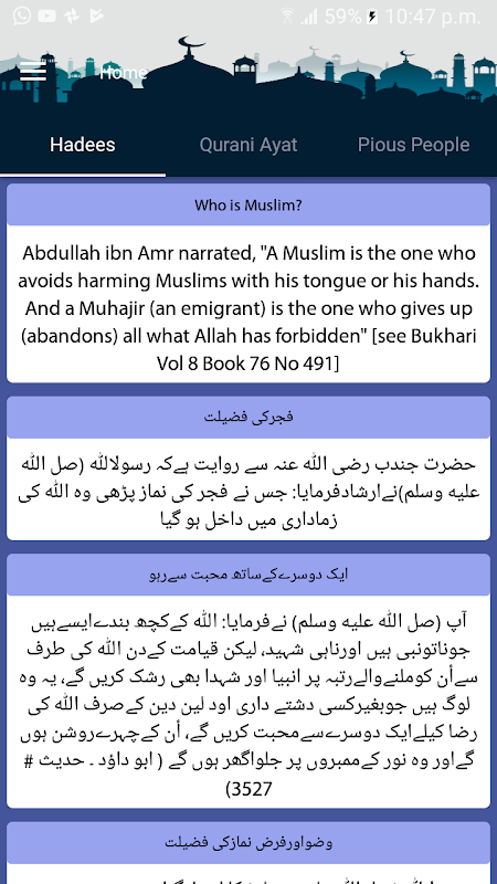 ♢ There are three options on the homepage. First one is about Hadith, second Qur'anic verses with Urdu translation and the third one is about sayings from prophets and famous Islamic scholars. New items will be uploaded daily on the homepage.