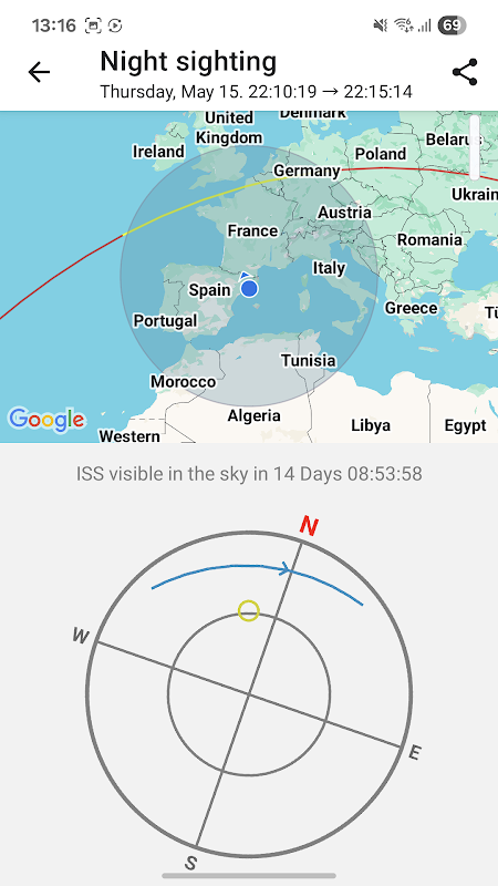 ✓ Passagem visível sobre sua região e Localize a Estação: através da ferramenta de bússola, você poderá saber o local exato no céu onde a ISS será visível a olho nu e por quanto tempo.