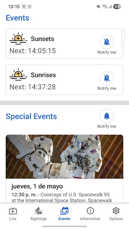 O ISS on Live irá informá-lo sobre o dia e a hora da passagem noturna visível da Estação Espacial Internacional. Através de um alerta configurável, você poderá receber notificações dos seguintes eventos: