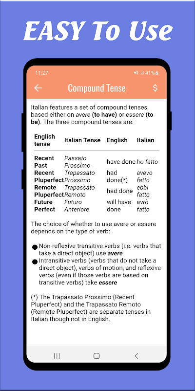 O aplicativo foi projetado e desenvolvido para facilitar o estudo da gramática italiana. Com este aplicativo, você pode aprender italiano gratuitamente com mais de 30 aulas. Aprenda gramática italiana com este aplicativo incrível e melhore sua gramática italiana. O aplicativo não usa internet para carregar dados. Assim, podemos aprender gramática italiana em todos os lugares e sempre.