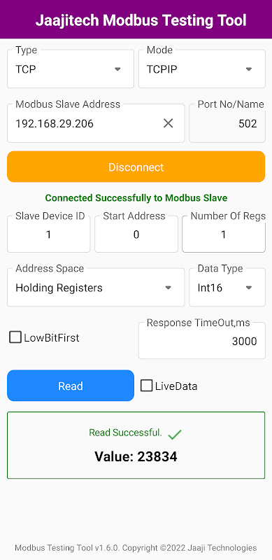 Qualquer dispositivo escravo Modbus pode ser testado facilmente usando este aplicativo de teste Modbus. Este aplicativo atualmente suporta apenas o protocolo Modbus TCP.