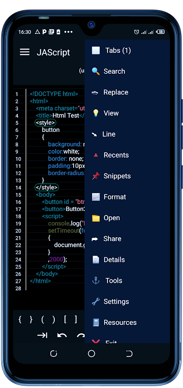 - Use o mecanismo JavaScript V8 para o Editor HTML e o Console JS através do WebView do Android.