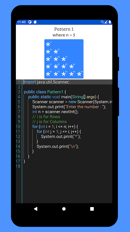 This Java pattern app is very helpful for understanding how loops can be used to generate these different ASCII art patterns & also for other basic concepts of Java with the help of programs.