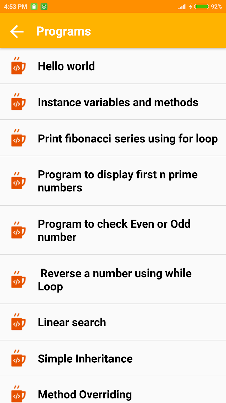 O aplicativo Tutorial e programação Java possui uma interface de usuário realmente simples e intuitiva. É o aplicativo muito bom para você aprender a programação Java de graça. Então, o que você está esperando? Baixe o aplicativo agora para se tornar um especialista em Java Programming Languages.