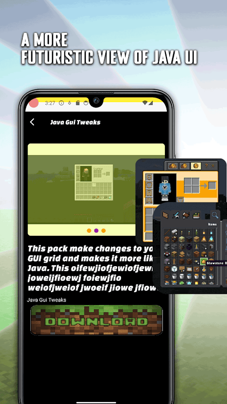 Experimente a facilidade e a beleza de uma interface de usuário mcpe ui aprimorada usando Java UI. O design elegante e responsivo cria uma experiência de navegação mais confortável e envolvente. A interface de usuário Java do mcpe apresenta uma combinação de design intuitivo com funcionalidade profunda, oferecendo aos jogadores maior controle sobre o mundo dos blocos. A interface de usuário atualizada fornece acesso fácil a vários recursos da aventura. Com uma navegação mais suave e menus bem organizados, você pode gerenciar facilmente seu inventário, acessar a criação e interagir com outros elementos do mundo sem dificuldade. A aparência estética também proporciona um toque visual refrescante, aumentando a satisfação da experiência de exploração.