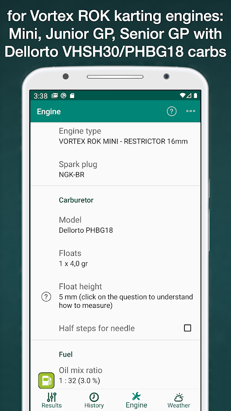 Este aplicativo fornece, usando temperatura, altitude, umidade, pressão atmosférica e configuração do seu motor, uma recomendação sobre a configuração ideal do carburador (JETTING) e vela de ignição para usar em motores Vortex ROK (ROK MINI, ROK GP JUNIOR, ROK GP SENIOR), que usam um Dellorto VHSH 30 & Dellorto PHBG 18 carburador